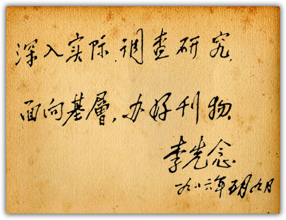 1986年5月 時任中共中央政治局常委、國家主席李先念為半月談題詞:深入實際,調查研究,面向基層,辦好刊物。