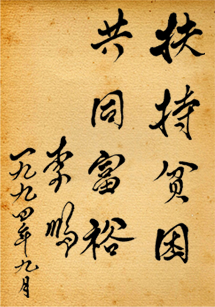 1994年9月 時任中共中央政治局常委、國務院總理李鵬為評選"全國十大扶貧狀元"活動題詞:扶持貧困 共同富裕